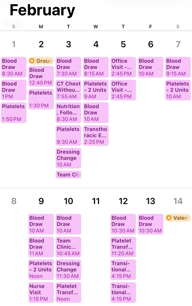 R has to go in for frequent blood tests and infusions of platelets and red blood cells. His blood counts are extremely low. For example, the normal range of platelets is 150-400 and R is at 51. Platelets thicken your blood and enable it to clot so you don’t bleed out if you get a bloody nose or have a brain bleed because you bumped your head.